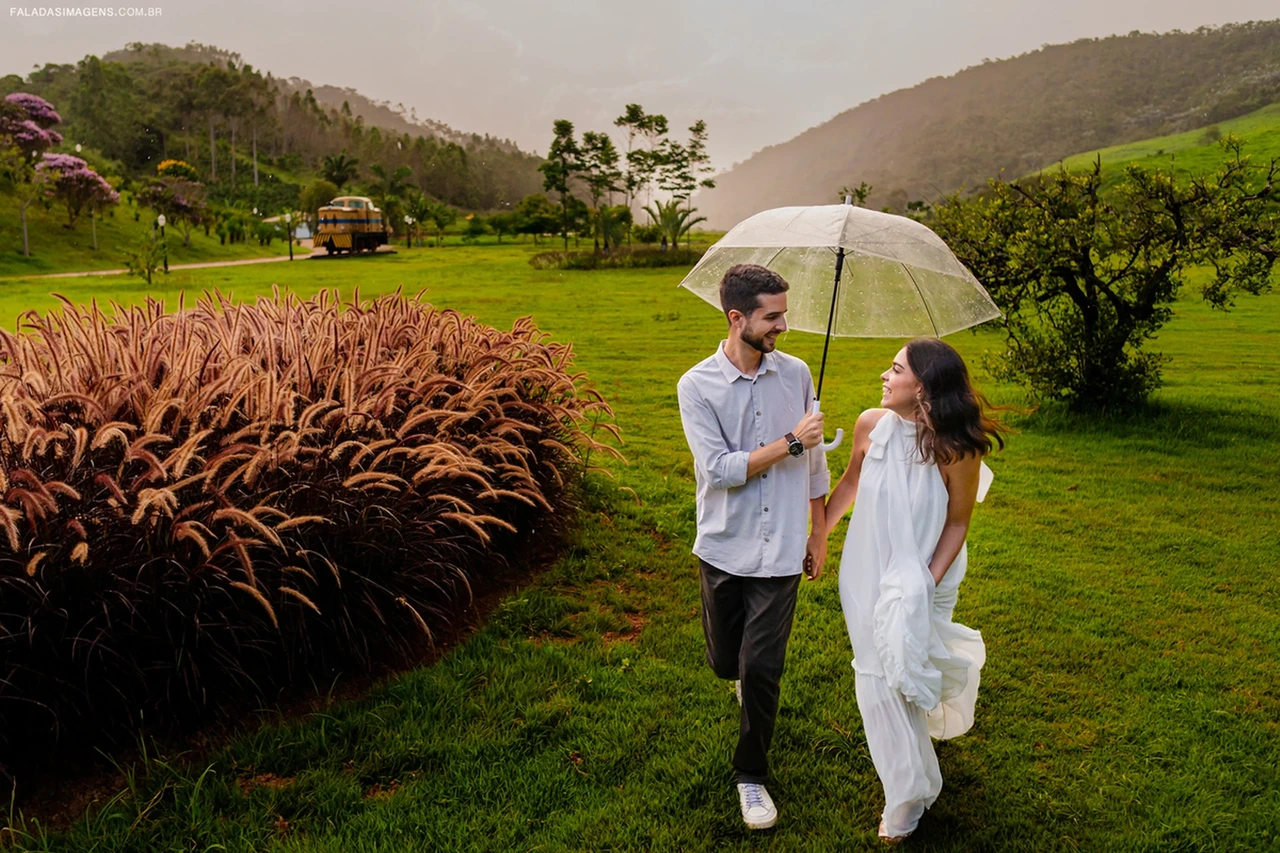 Por outro lado, se vocês gostam de um estilo mais descontraído ou ousado, um ensaio na chuva pode ser incrível, usando acessórios divertidos como guarda-chuvas transparentes. O importante é que faça sentido para vocês.