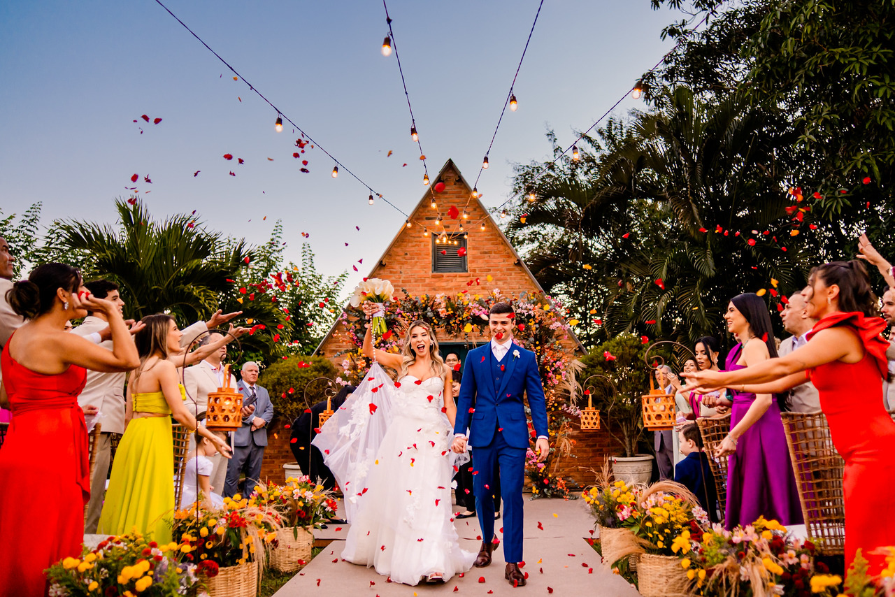 Com arroz, bolhas ou sem nada — esse momento traz leveza, riso e alívio. No casamento da Marines e do Inácio em Muriaé, a saída foi sob pétalas de rosa jogadas pelas madrinhas.