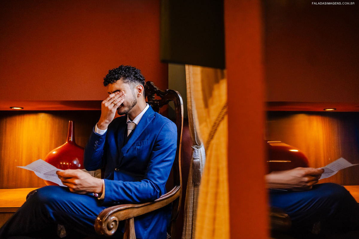 A noiva sozinha olhando pela janela, o noivo sentado respirando fundo antes da entrada. No casamento da Marphiza e do Adeilson em Santa Bárbara, fotografamos os dois separados, mas ambos parando por um minuto — e essas imagens têm força poética.